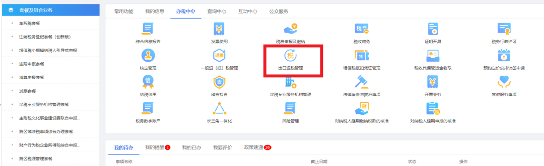 1、登录宁波市电子税务局,点击【办税中心】-【出口退税管理】