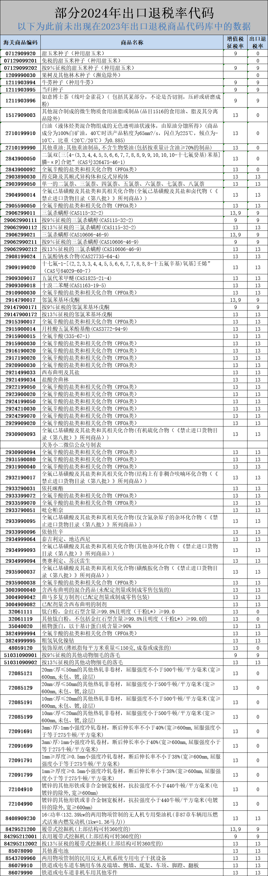 下表为:有出现在2024年出口退税代码表中,但未出现过在2023年中。大多数为代码新增或拆分而来。